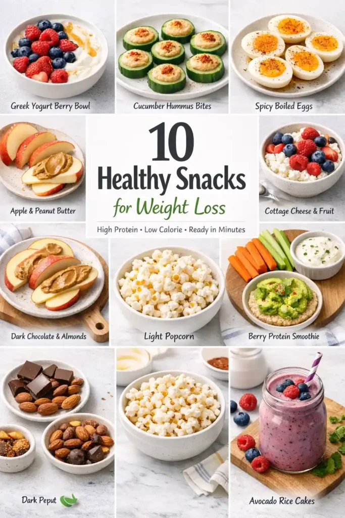 Here are 10 easy snack recipes for weight loss—each one is balanced, satisfying, and simple to make at home. These focus on high protein, fiber, and healthy fats to keep you full longer while staying calorie-conscious.
