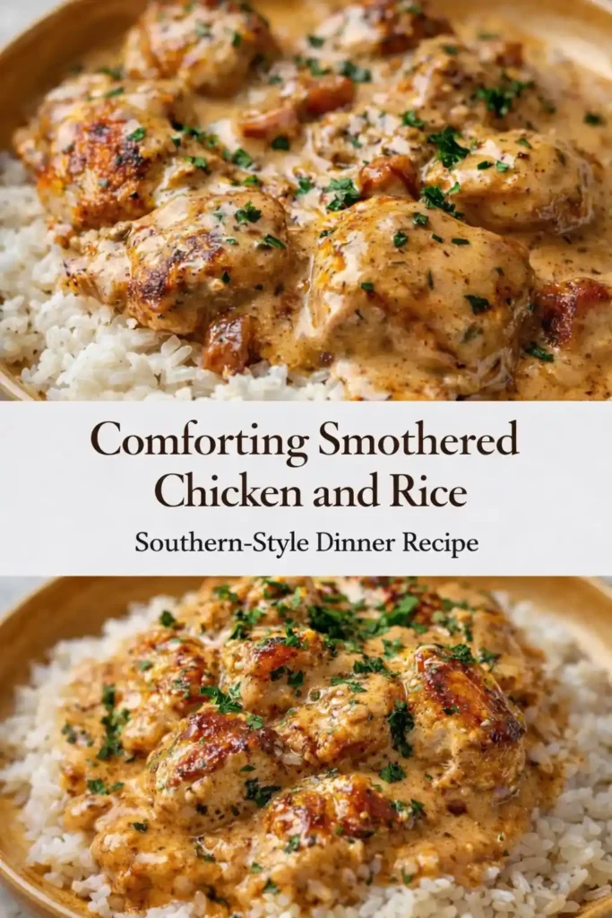 This comforting smothered chicken and rice recipe is pure cozy goodness—tender chicken simmered in a rich, savory gravy and served over fluffy rice. It’s the kind of meal that feels like a warm hug after a long day and works perfectly for busy weeknights or relaxed Sunday dinners. With simple pantry staples and one pan, you’ll have a hearty, family-friendly comfort food recipe that tastes like it cooked all day. Creamy, flavorful, and incredibly satisfying, this chicken and rice dish is easy enough for beginners but delicious enough to earn a permanent spot in your dinner rotation. 🍗🍚