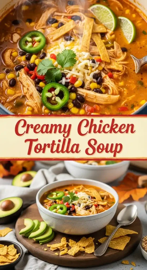 This Creamy Chicken Tortilla Soup delivers all the bold Tex-Mex flavors you love—tender chicken, sweet corn, warm spices, and a silky, crowd-pleasing broth. It’s the perfect one-pot dinner for busy nights because everything simmers together in under an hour, filling your kitchen with irresistible aromas. Rich but not heavy, this soup has the perfect balance of creaminess and spice, making it ideal for family meals, meal prep, or chilly evenings when you want something comforting and fun. Top it with crunchy tortilla strips, cheese, and fresh lime for the ultimate cozy bowl. 🌶️✨