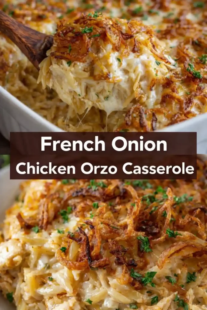 This French onion chicken orzo casserole is the ultimate comfort meal—rich, savory, and packed with deep caramelized onion flavor. Juicy chicken, tender orzo, and a cheesy, golden topping come together in one cozy dish that feels like a hug in a bowl. It’s perfect for busy weeknights since everything bakes together in one pan, saving you time and cleanup. Inspired by classic French onion soup, this recipe brings that same irresistible flavor into a hearty, family-friendly casserole you’ll want on repeat.