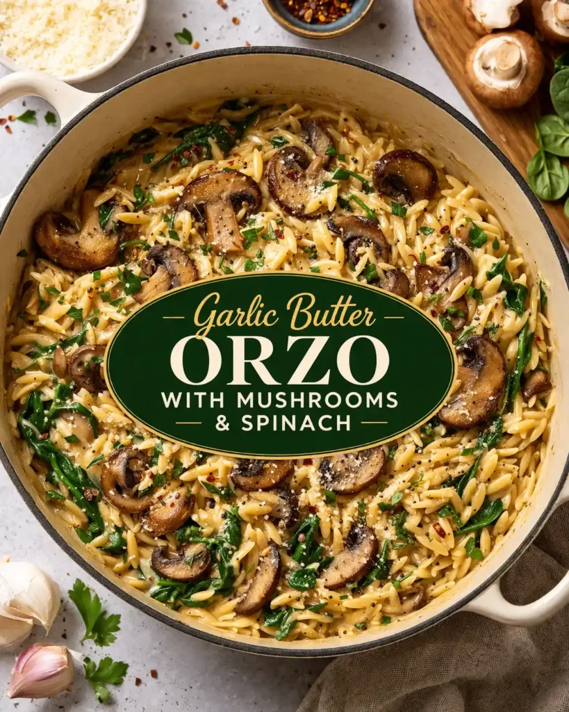 This Garlic Butter Orzo with Mushrooms & Spinach is the kind of cozy, comforting dish you’ll want on repeat. It’s rich, buttery, and packed with earthy mushrooms and fresh spinach, all cooked together in one pan for easy cleanup. Perfect for quick weeknight dinners or a simple yet elegant side, this recipe delivers big flavor with minimal effort. The orzo turns silky and slightly creamy as it cooks, soaking up all that garlicky goodness—making every bite irresistible!