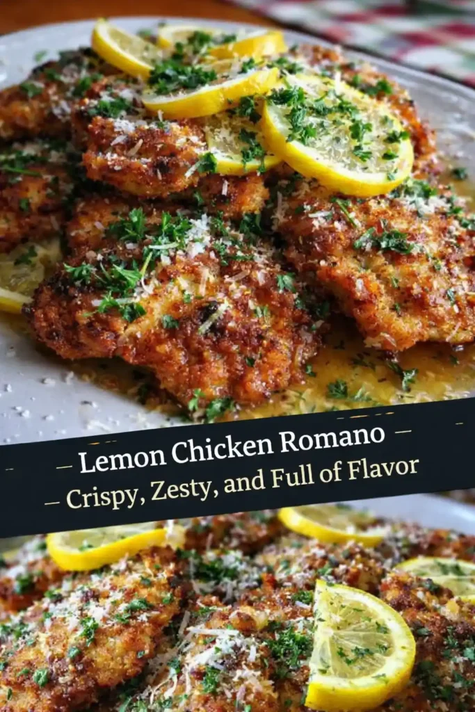 This Lemon Chicken Romano is bright, crispy, and packed with bold Italian-inspired flavor. Juicy chicken cutlets are coated in a golden Romano cheese crust, pan-fried until perfectly crisp, then finished with a fresh lemony sauce that balances richness with zing. Itβs elegant enough for guests yet quick enough for a weeknight dinner. With simple pantry staples and a short cook time, this dish is perfect for busy home cooks who still want something impressive. If you love crispy chicken dinners and lemon-forward recipes, this one is a must-try πβ¨.