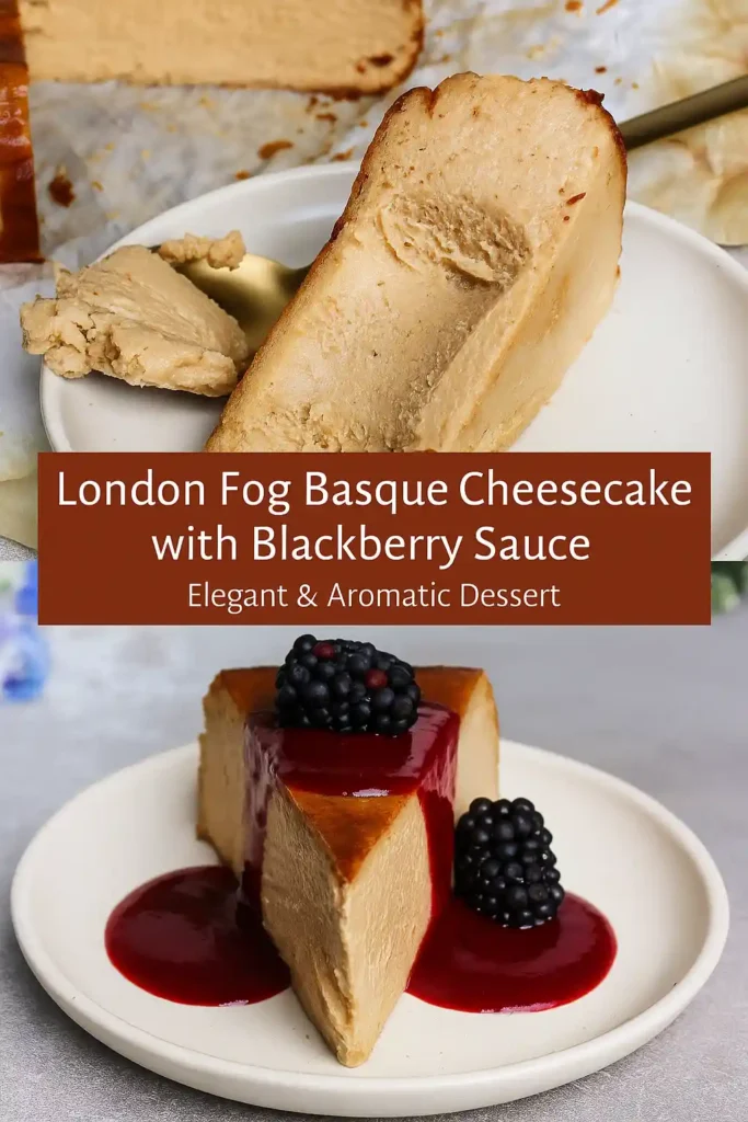 This London Fog Basque Cheesecake combines the magic of a classic burnt Basque cheesecake—creamy center, caramelized top, rustic edges—with the cozy flavors of a London Fog latte. Earl Grey tea infuses the batter with soft floral notes, while a swirl of homemade blackberry sauce adds brightness and a touch of tart sweetness. It’s a showstopping, café-style dessert that’s surprisingly beginner-friendly thanks to its intentionally imperfect look and simple mixing method. Perfect for brunches, celebrations, or when you want a dessert that feels both modern and classy.