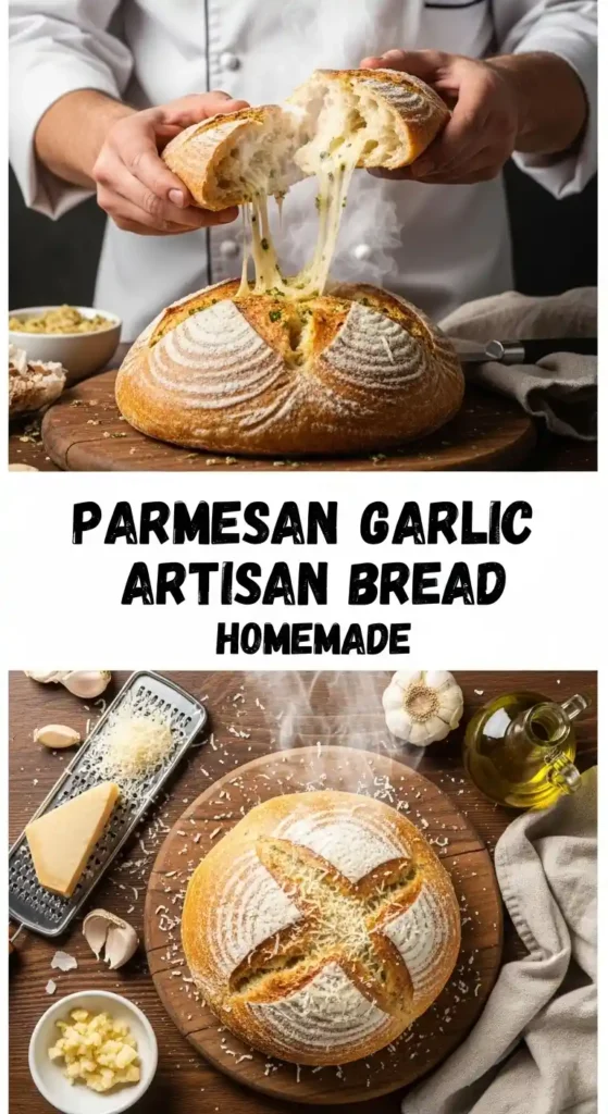 If you’ve ever dreamed of pulling a warm, golden loaf of homemade bread straight from your oven, this Parmesan Garlic Artisan Bread will make that dream come true! With its crunchy crust, fluffy center, and savory garlic-Parmesan aroma, it’s the kind of bread that makes everyone gather around the kitchen. Best of all, it’s shockingly easy to make — no mixer or kneading required! Perfect for cozy weekends, family dinners, or impressing guests at brunch, this bread is your new go-to for bakery-quality flavor right at home. 🍞