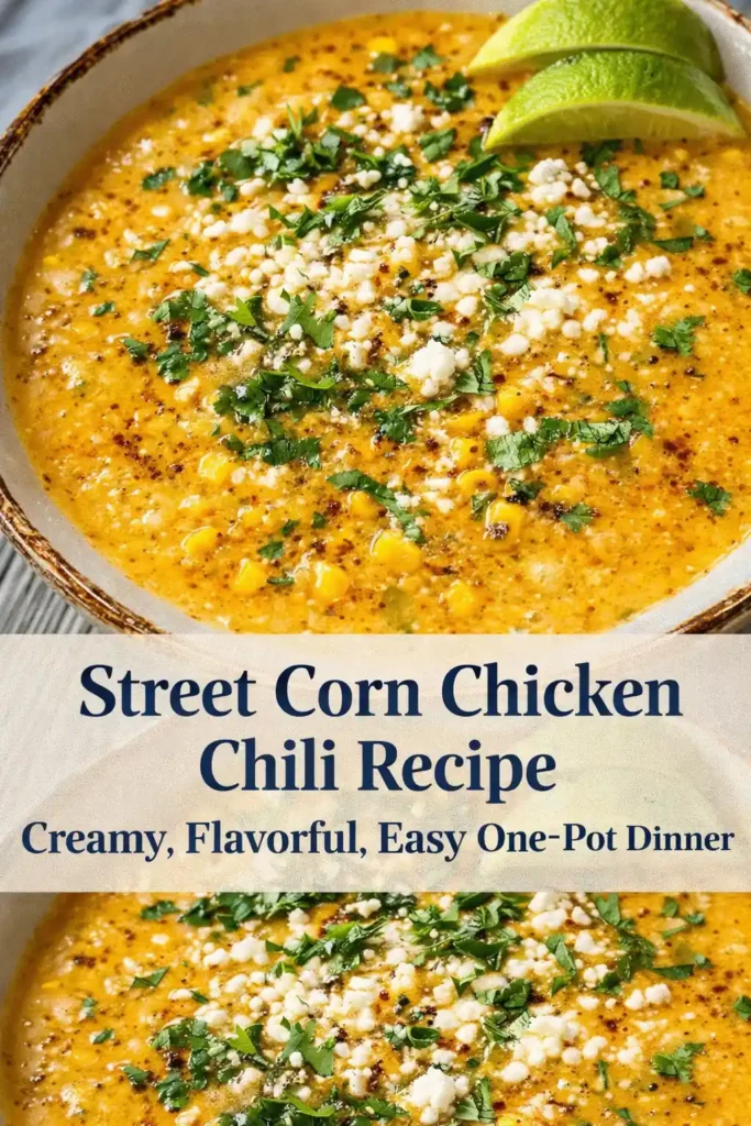 This Street Corn Chicken Chili is everything you love about Mexican street corn—smoky, creamy, tangy—turned into a cozy, satisfying chili. Tender chicken, sweet corn, warm spices, and a touch of lime come together in one pot for a dinner that feels indulgent but is incredibly easy to make. It’s perfect for busy weeknights, game days, or when you want something comforting without spending hours in the kitchen. This recipe is a Pinterest favorite because it’s family-friendly, customizable, and meal-prep friendly. One spoonful and you’ll see why this creamy chicken chili keeps everyone coming back for seconds.