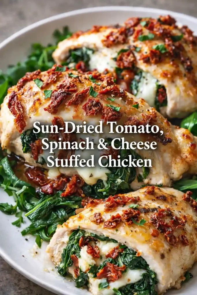 This sun-dried tomato, spinach, and cheese stuffed chicken is a simple yet impressive dinner that’s packed with flavor. Tender chicken breasts are filled with a creamy mixture of sautéed spinach, tangy sun-dried tomatoes, and melted cheese, then baked until juicy and golden. The savory filling keeps the chicken moist while creating a rich Mediterranean-inspired taste in every bite. It’s perfect for weeknight dinners, meal prep, or even a special dinner when you want something elegant without a lot of effort. Best of all, the recipe uses everyday ingredients and comes together in under an hour.